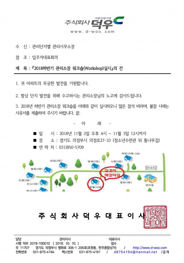■ 2018년 하반기 관리소장 워크숍(Workshop) 실시 ■ 페이지 정보 작성자 최고관리자 (115.♡.139.242) 작성일18-10-10 16:58 조회9,627회 댓글0건 관련링크 이전글 다음글 목록 본문 많은 참석 바랍니다...^^ [이 게시물은 최고관리자님에 의해 2019-10-07 11:45:09 공지사항에서 복사 됨] 댓글목록 등록된 댓글이 없습니다. 이전글 다음글 목록